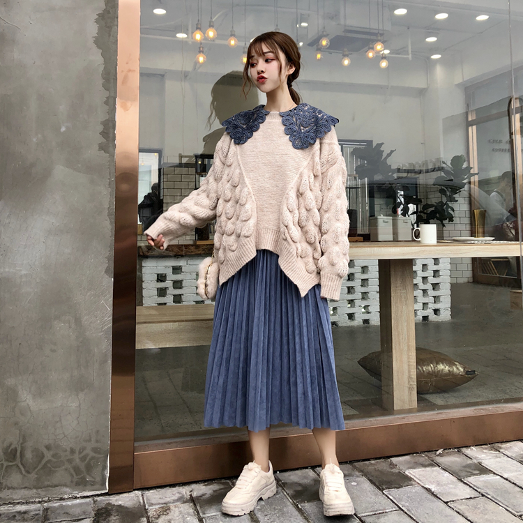 / 韓版時尚休閑套裝秋季寬松針織毛衣外套+花邊襯衣+百褶裙三件套女