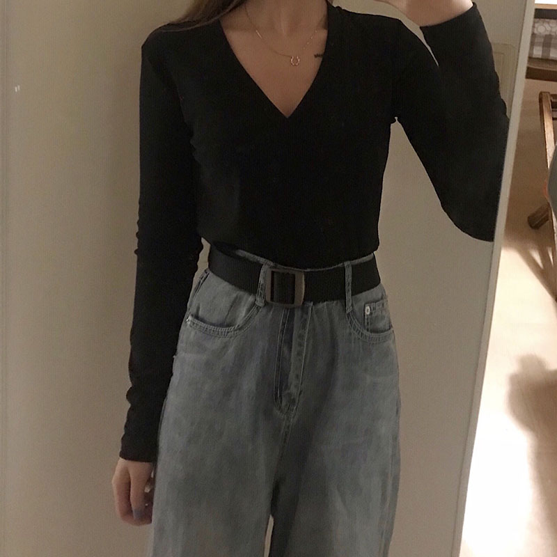 秋天上衣女時尚韓版深V領性感純色長袖T恤修身顯瘦打底長袖T恤潮