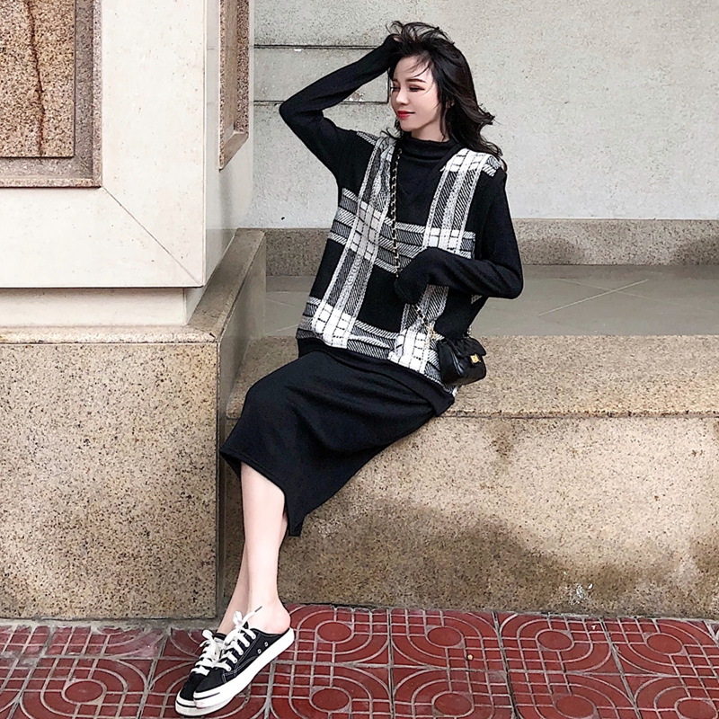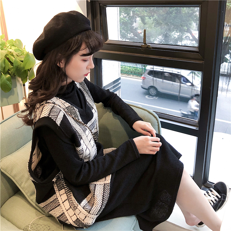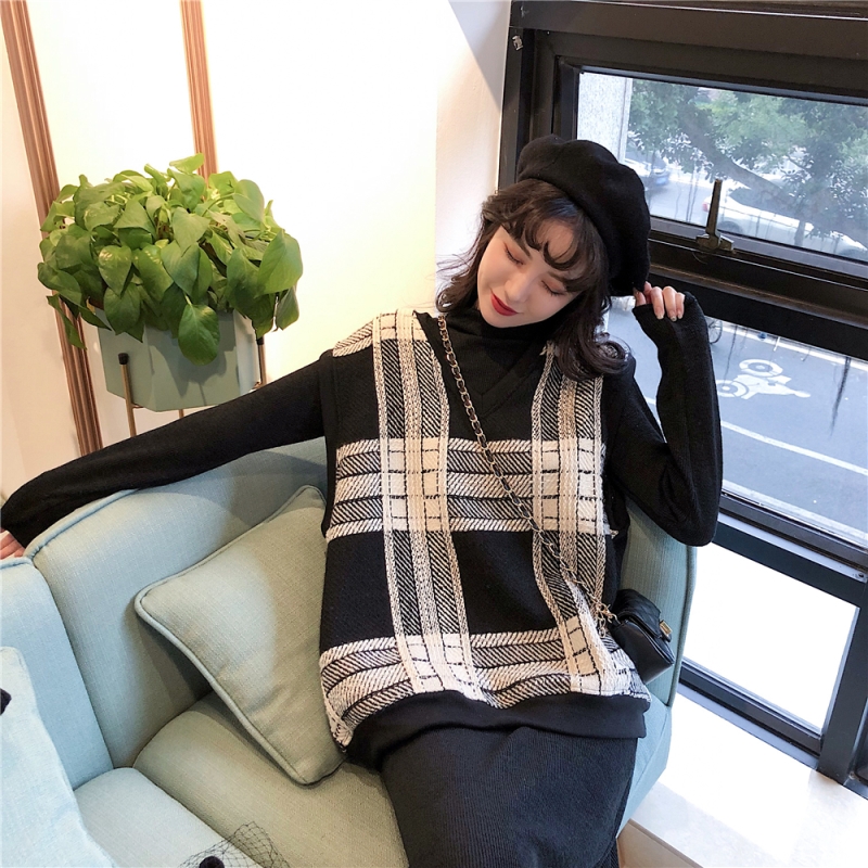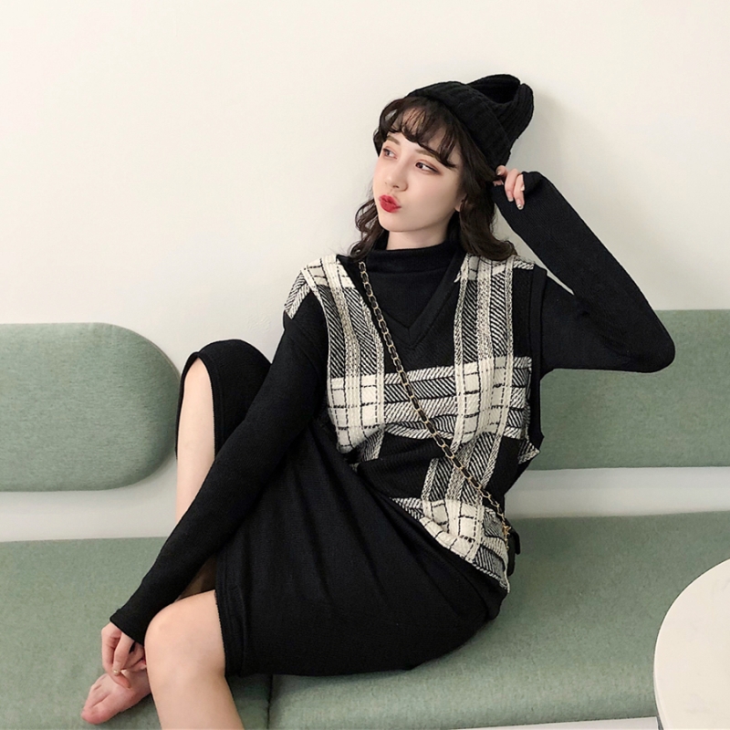 / 秋冬季新款格紋寬松V領毛呢馬甲背心外套女+針織高領連衣裙兩件套