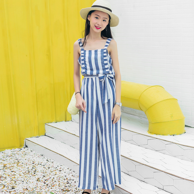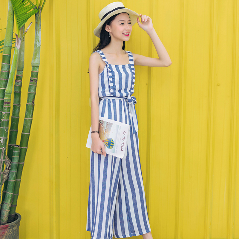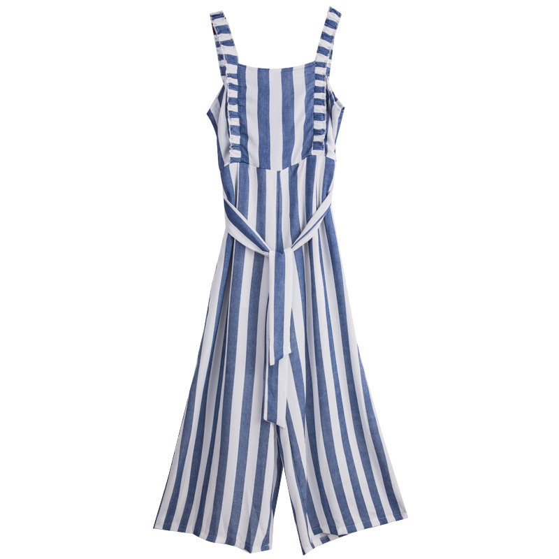 配腰帶豎條紋吊帶連體闊腿褲,氣質爆棚的一款連體褲