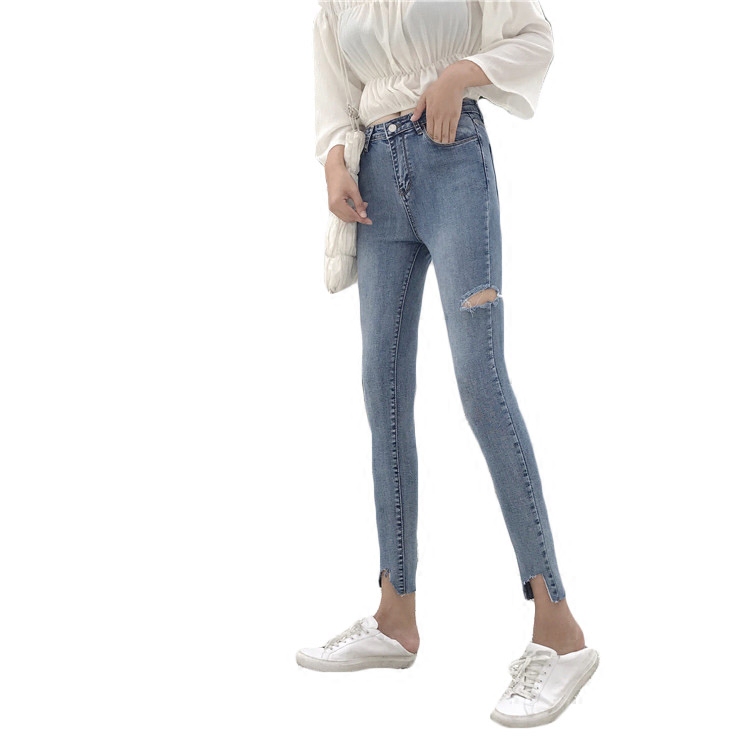 秋季新款復古港味 高腰緊身彈力破洞牛仔褲氣質水洗小腳鉛筆褲女