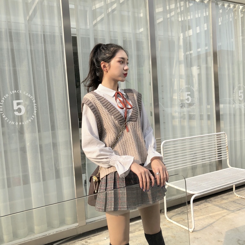 淺卡其色 針織馬甲|米白色 針織馬甲|淺灰色 襯衫|淺藍色 襯衫|卡其色百褶裙內襯|藍色 百褶裙內襯