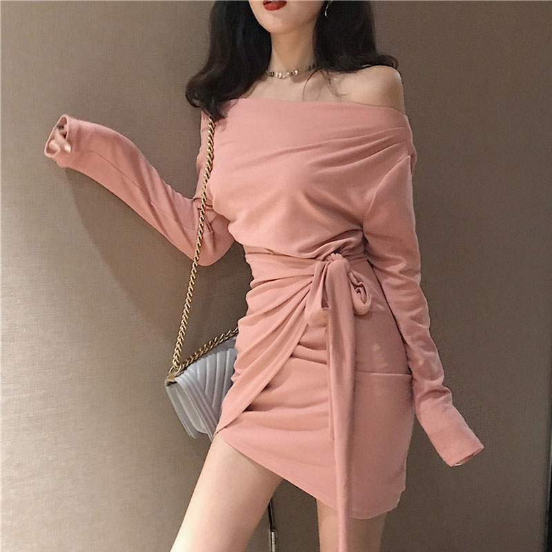 秋裝女2018新款韓版心機一字露肩連衣裙氣質修身不規則綁帶黑裙子