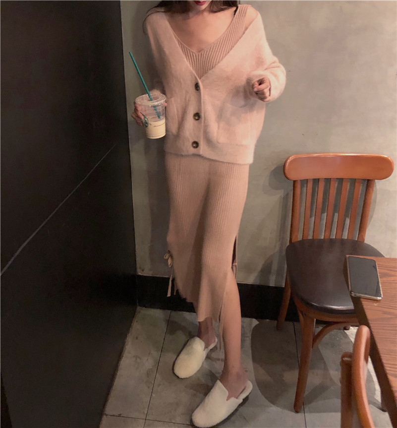 / 2018新款秋冬慵懶寬松短款chic百搭開衫長款內搭連衣裙毛衣兩件套