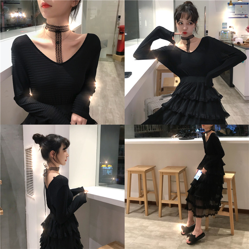 / 2018秋冬港味新款時尚V領打底蛋糕裙網紗蕾絲黑色中長款連衣裙女