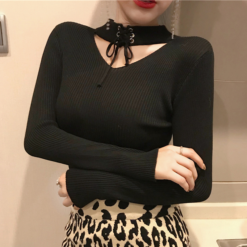 心機漏鎖骨掛脖針織打底衫秋季新款長袖上衣女裝修身顯瘦T恤衣服