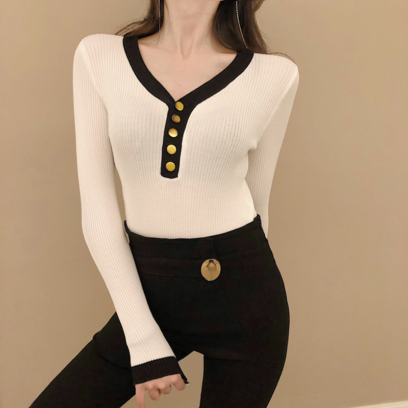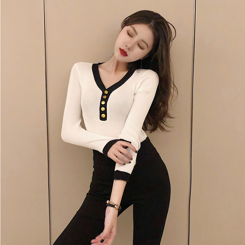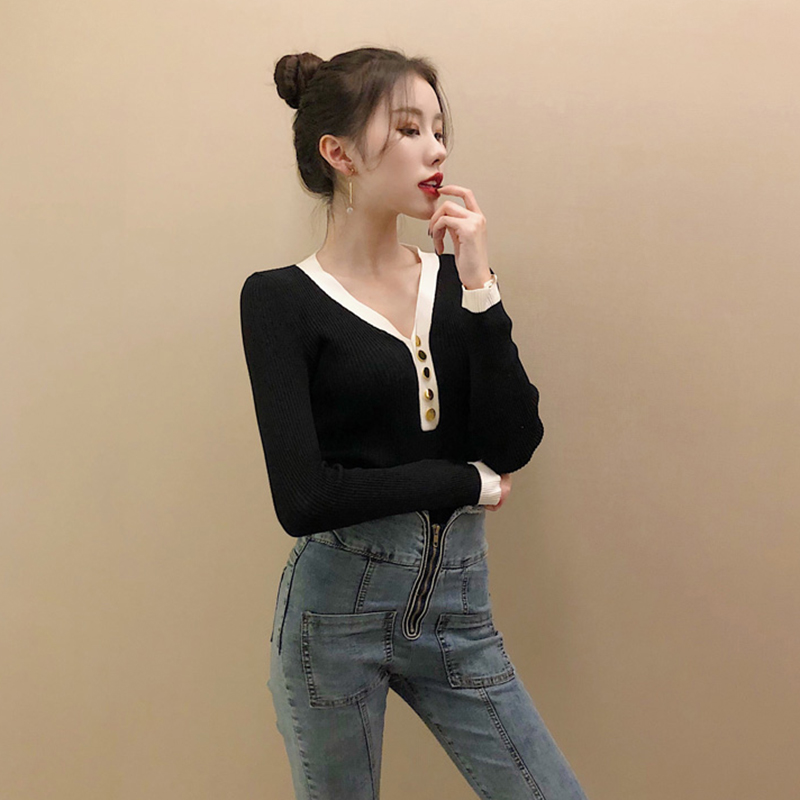 / chic百搭顯瘦打底薄毛衣女秋冬裝2018新款時尚復古V領套頭針織衫