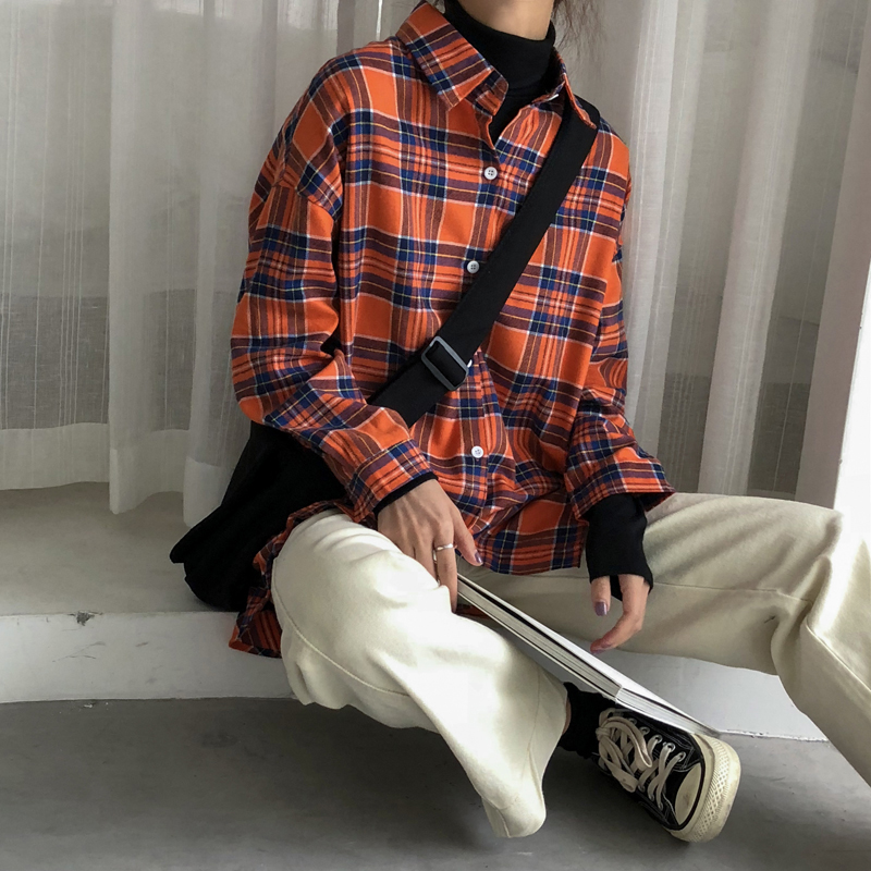 / 復古格子寬松長袖上衣秋裝女2018新款小清新學生慵懶休閑襯衫外套