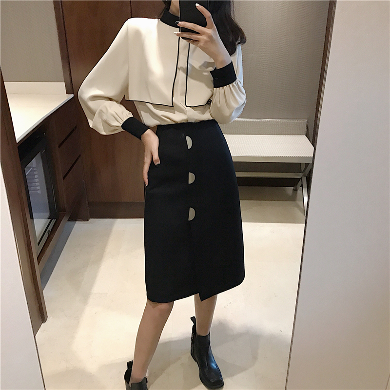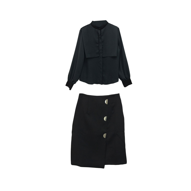 / 韓版秋裝女2018新款立領撞色披肩襯衫女+半圓金屬扣半身裙兩件套