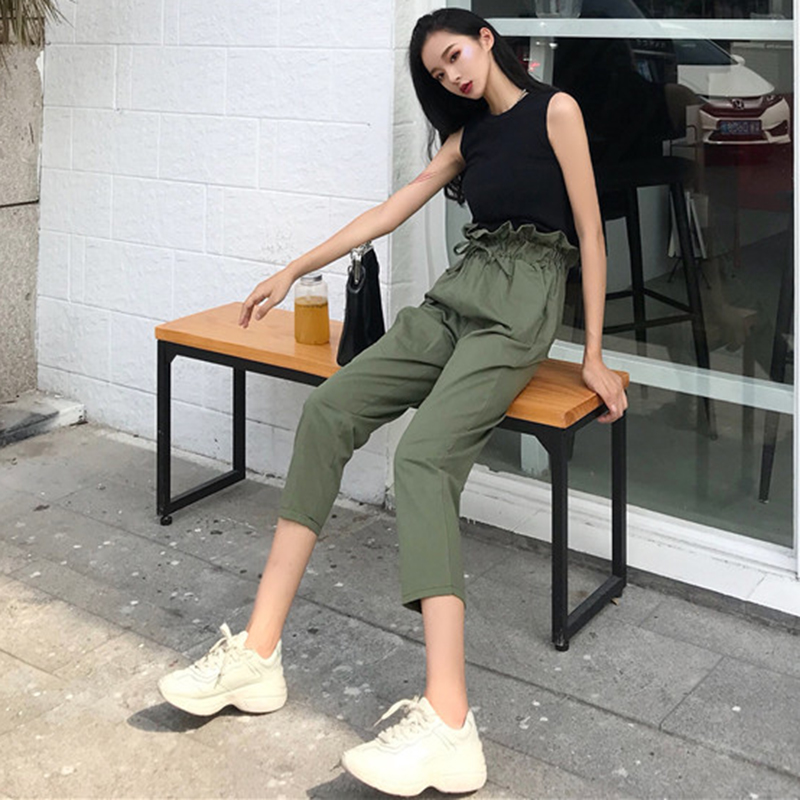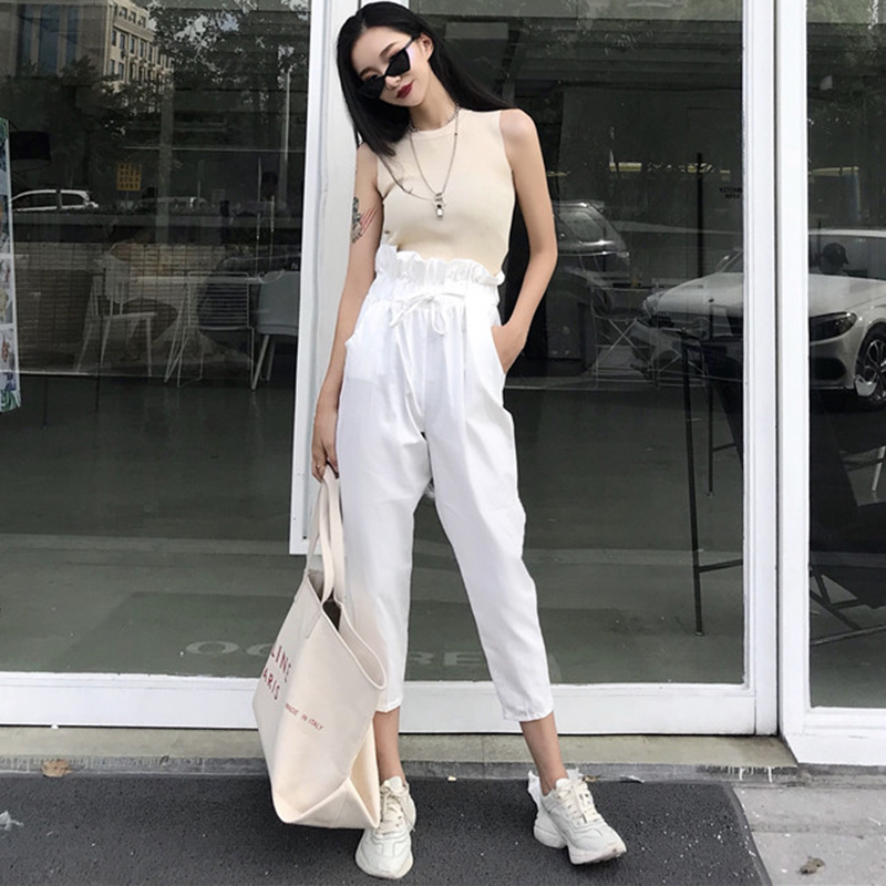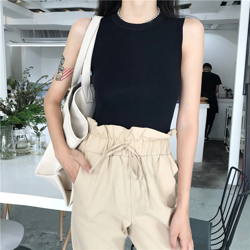 晚晚風復古套裝女夏2018新款女裝針織背心上衣+高腰花苞哈倫褲子