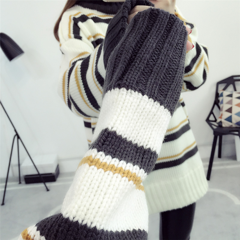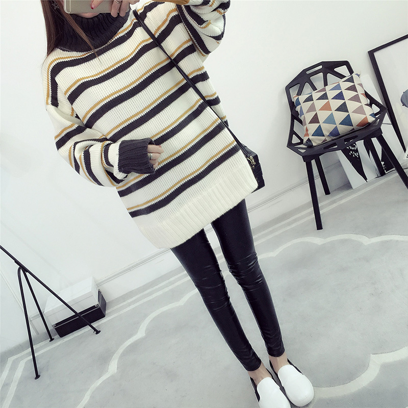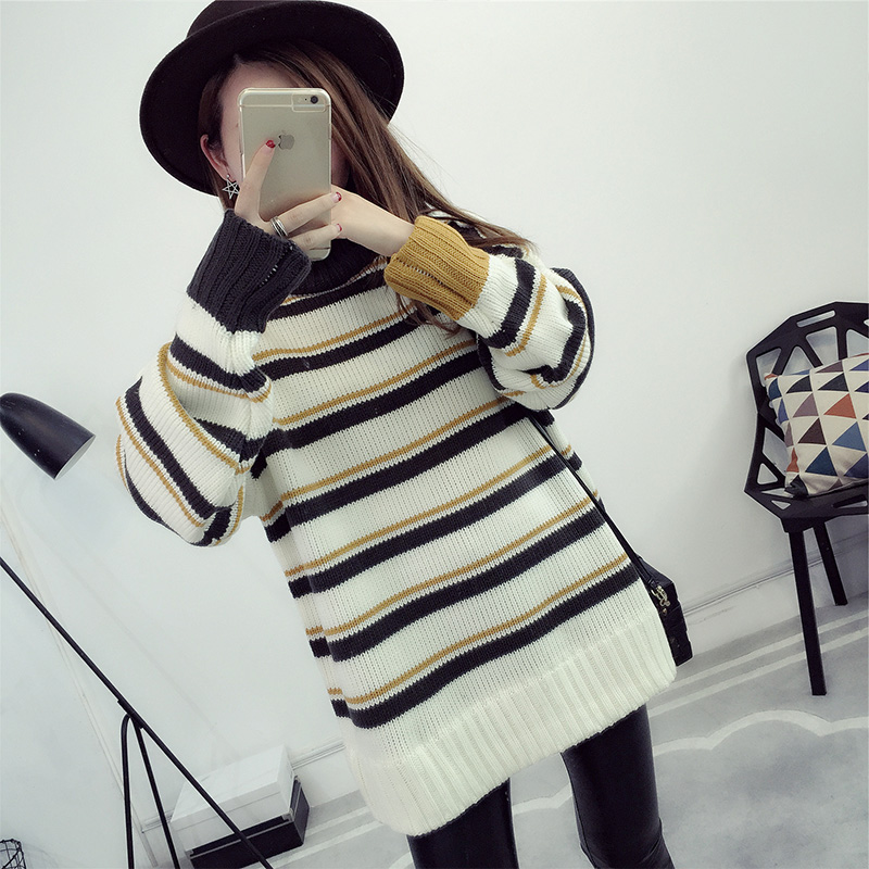 套頭毛衣女秋冬韓版寬松中長款條紋針織衫外套女裝秋裝新款潮