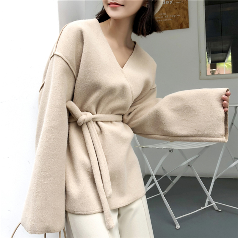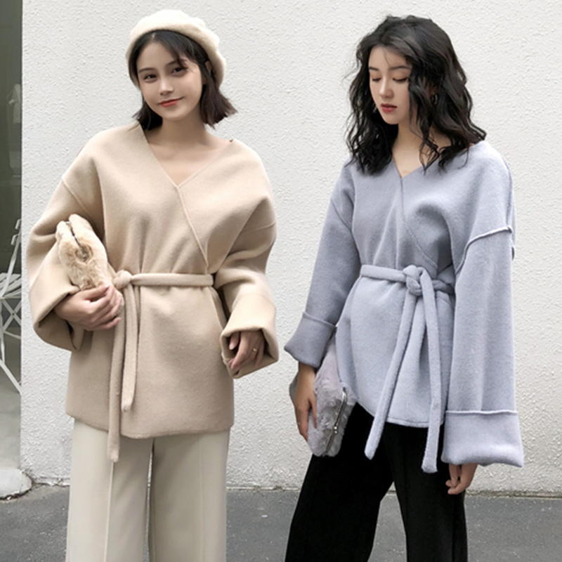 / 2018流行毛呢外套女秋冬裝新款赫本收腰顯瘦V領學生寬松長袖上衣
