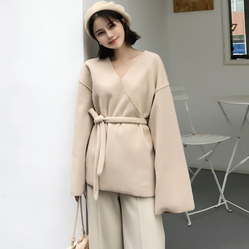 2018流行毛呢外套女秋冬裝新款赫本收腰顯瘦V領學生寬松長袖上衣