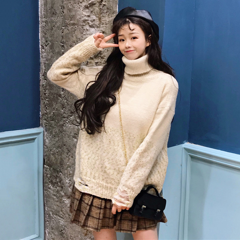 慵懶風拼色漸變毛衣外套女秋冬裝2018新款韓版寬松破洞高領針織衫