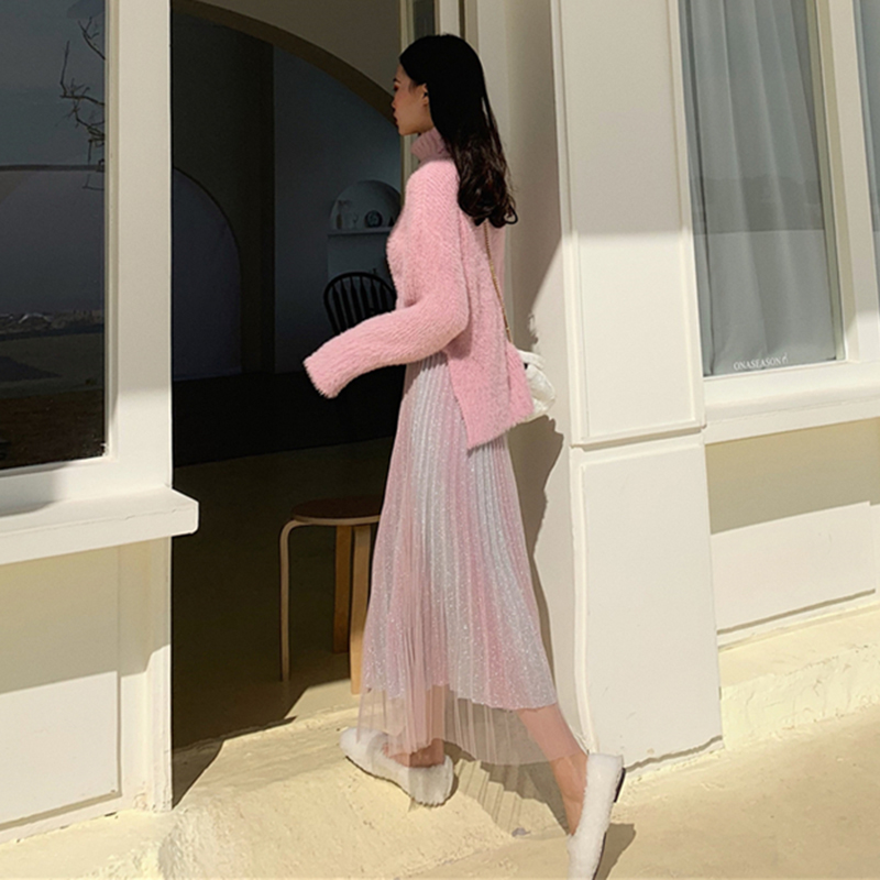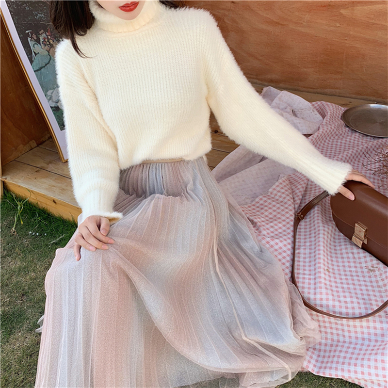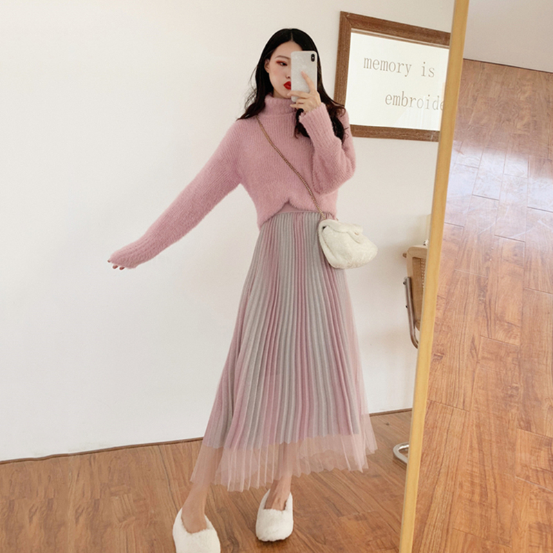 毛衣配裙子兩件套女裝秋冬新款寬松高領套頭針織衫高腰A字百褶裙