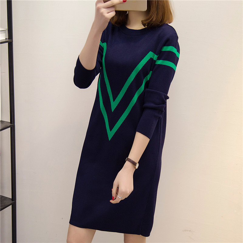 條紋針織衫套頭毛衣女秋冬季女裝連衣裙中長款長袖寬松新款潮
