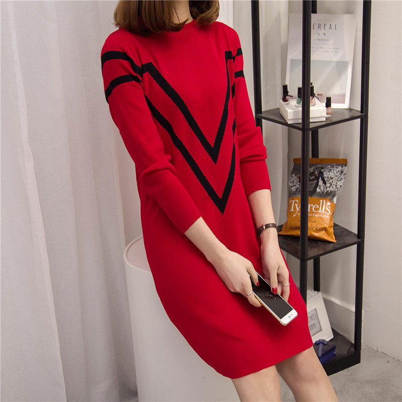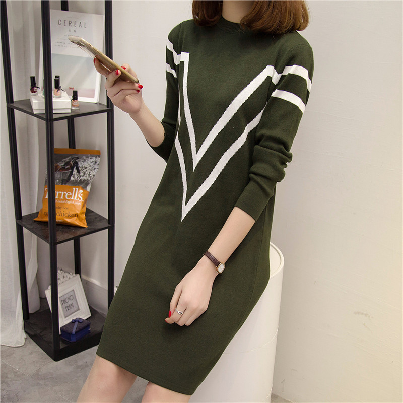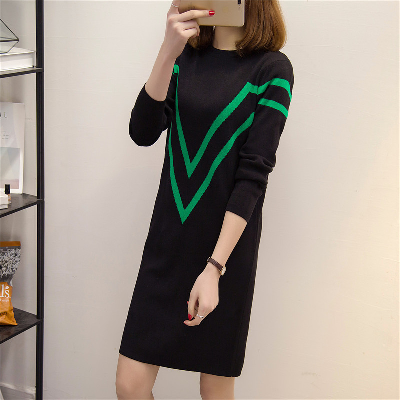 / 條紋針織衫套頭毛衣女秋冬季女裝連衣裙中長款長袖寬松新款潮