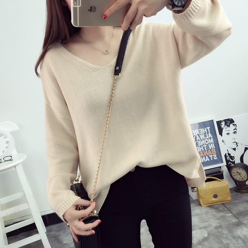 / 毛衣春秋新款套頭女寬松針織打底衫v領長袖薄款毛衣春裝百搭