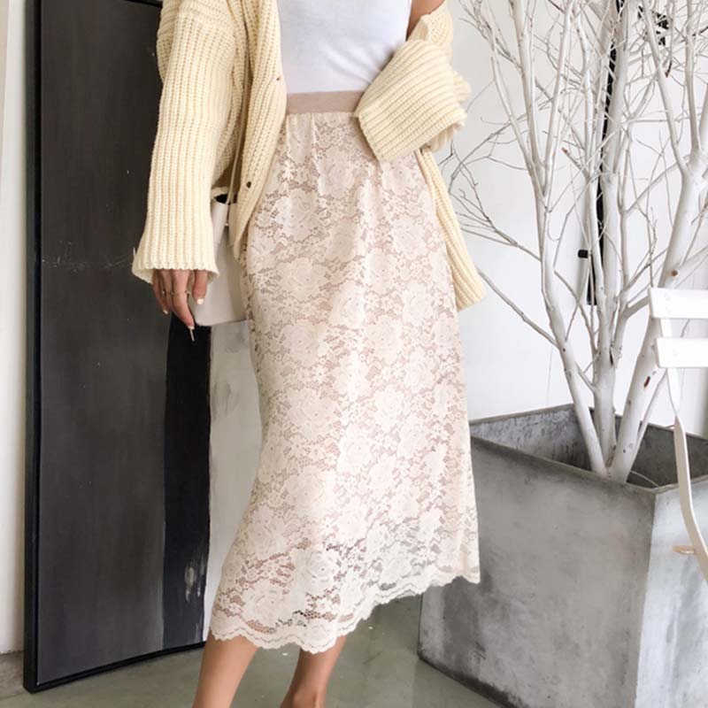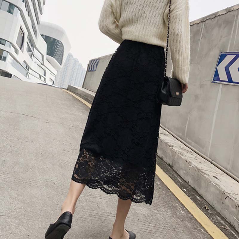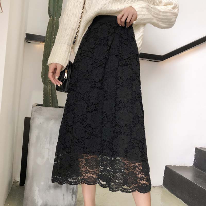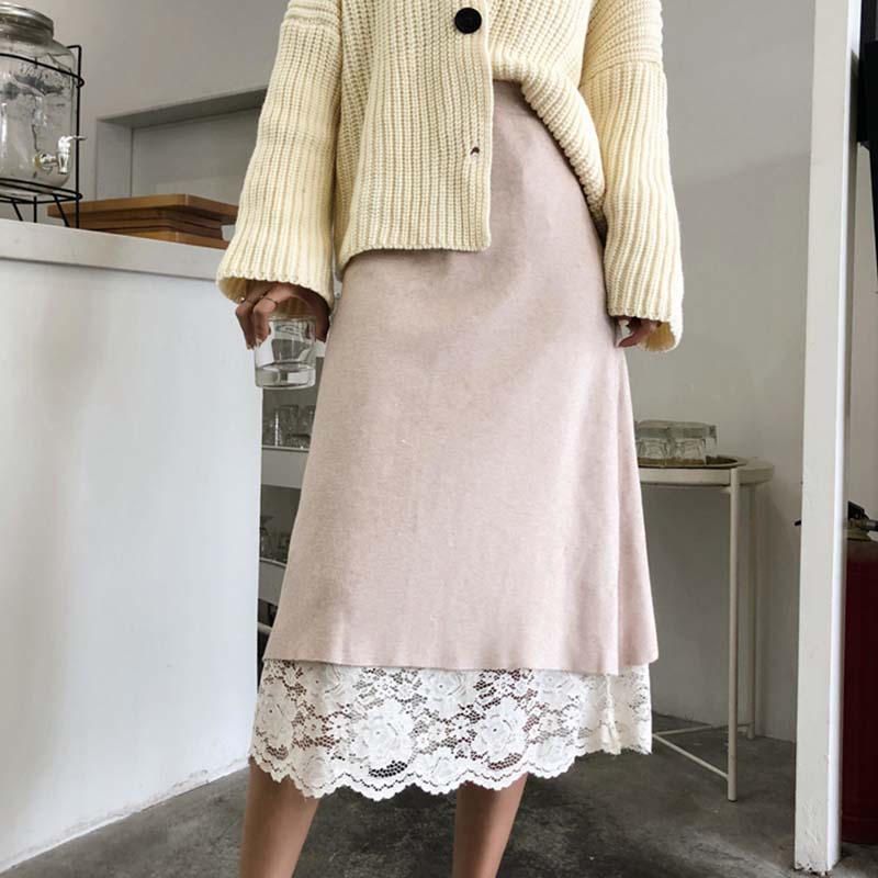 / 時尚兩面穿蕾絲針織裙秋裝女2018新款高腰顯瘦A字裙氣質中長裙子