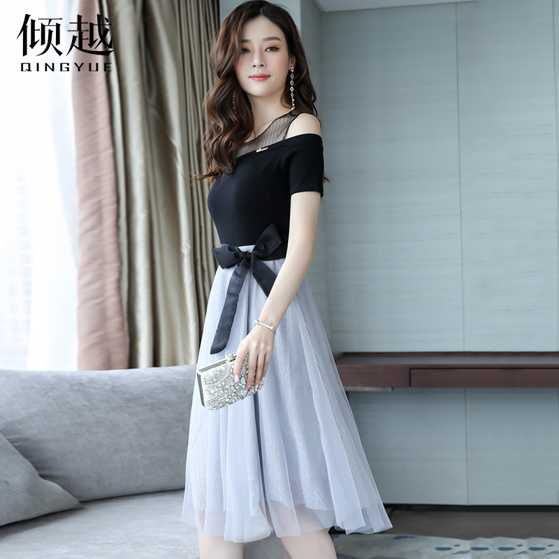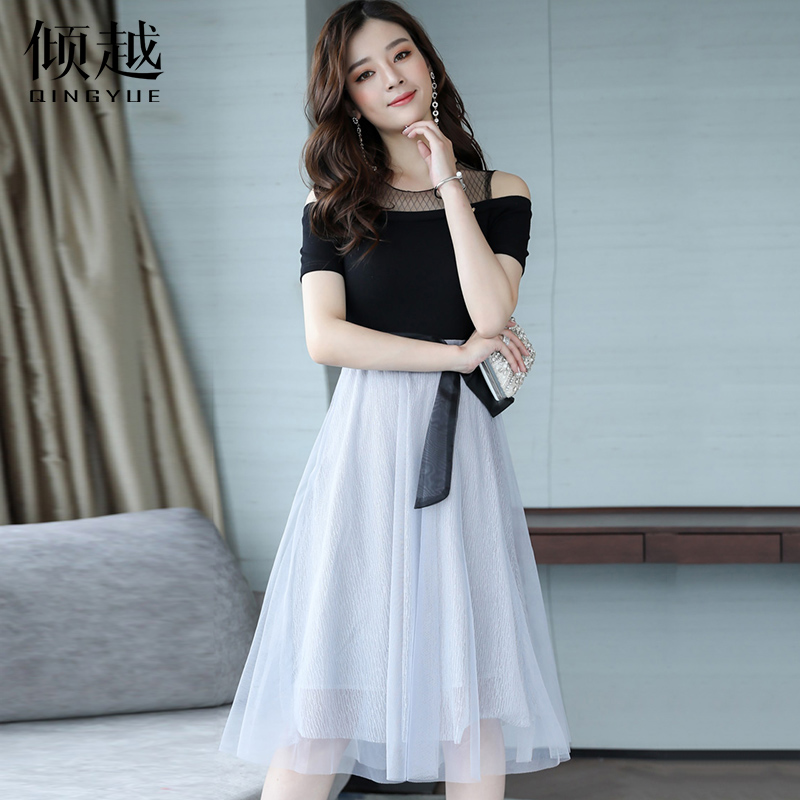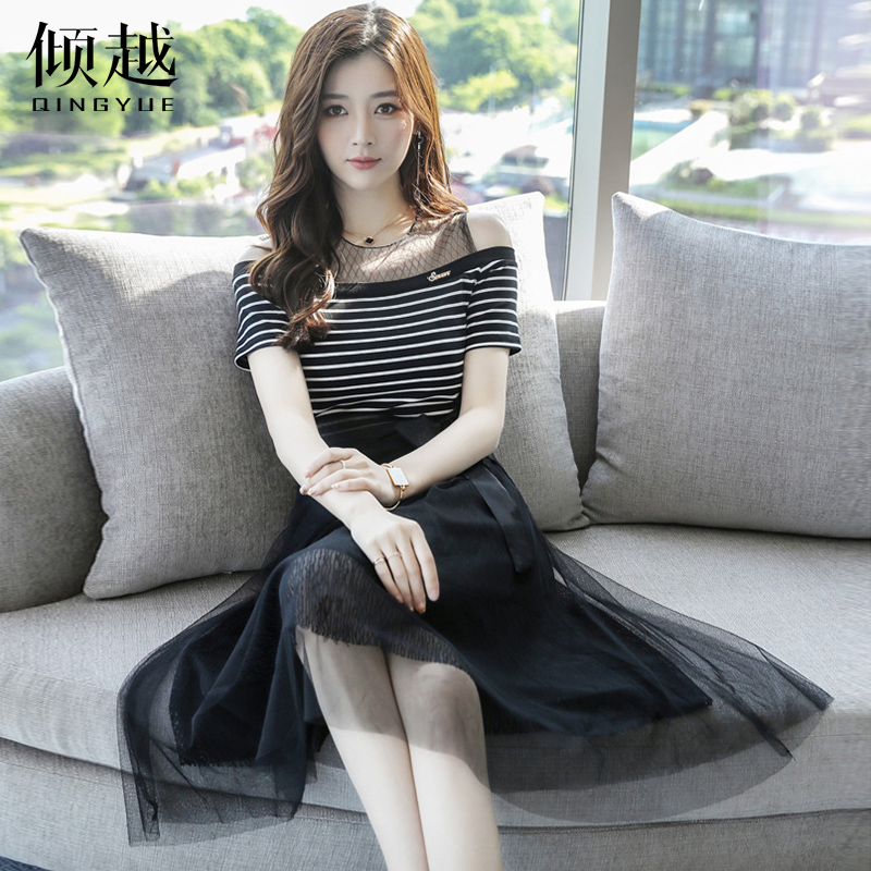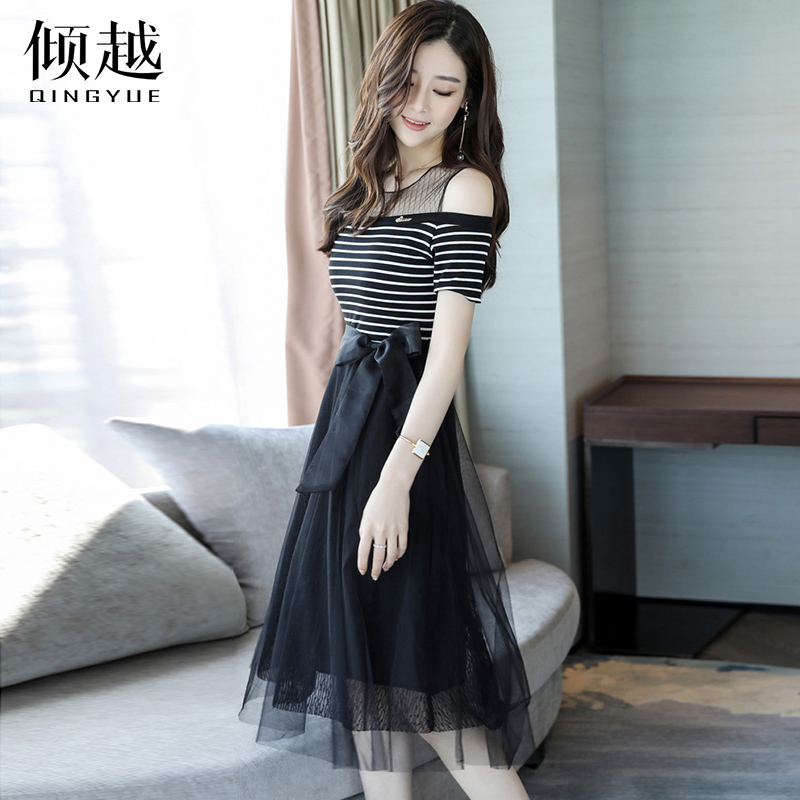 連衣裙女夏2017新款韓版時尚修身紗網拼接圓領條紋漏肩短袖中長裙