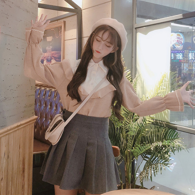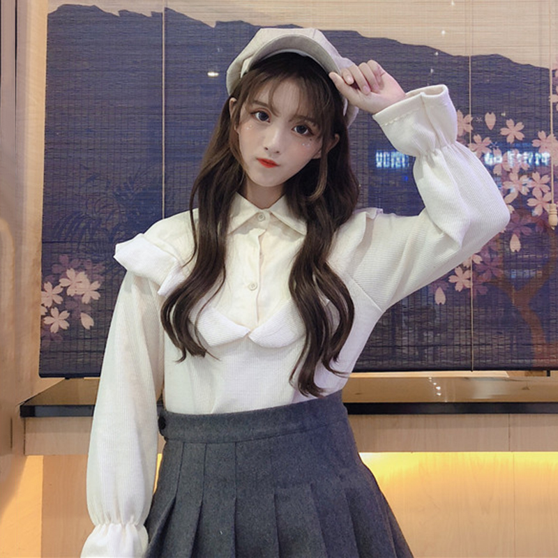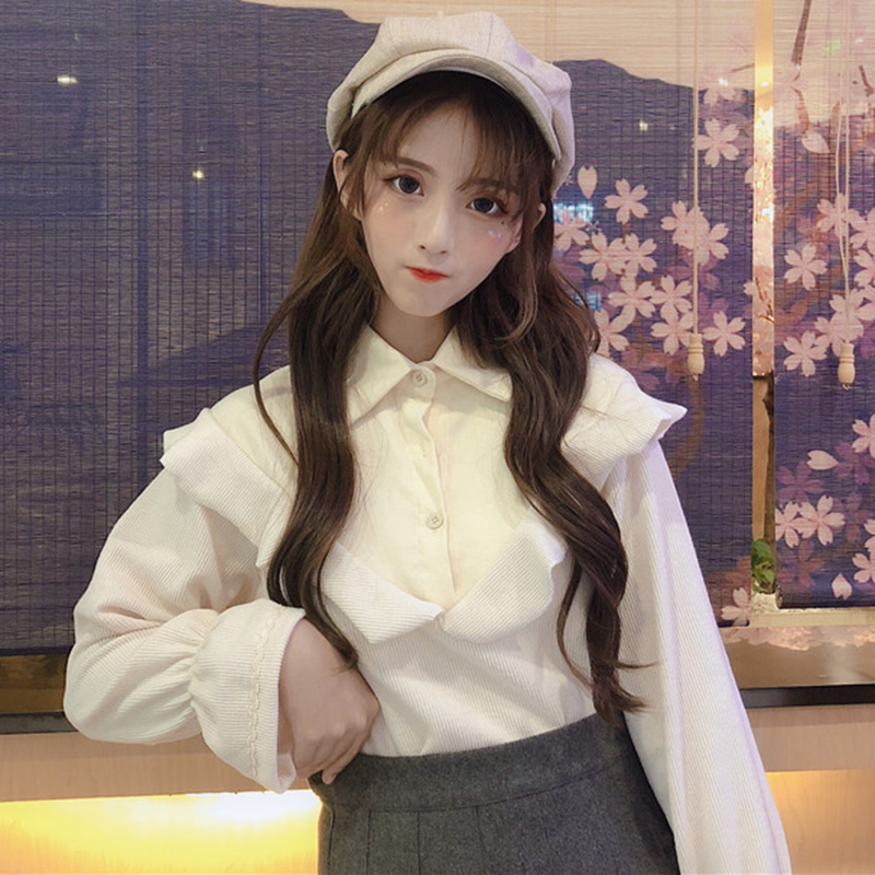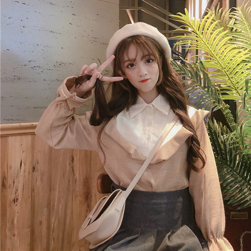 chic風洋氣襯衣女秋冬裝2018新款韓版寬松喇叭長袖拼接荷葉邊襯衫
