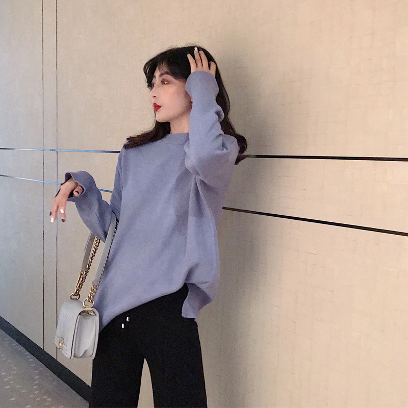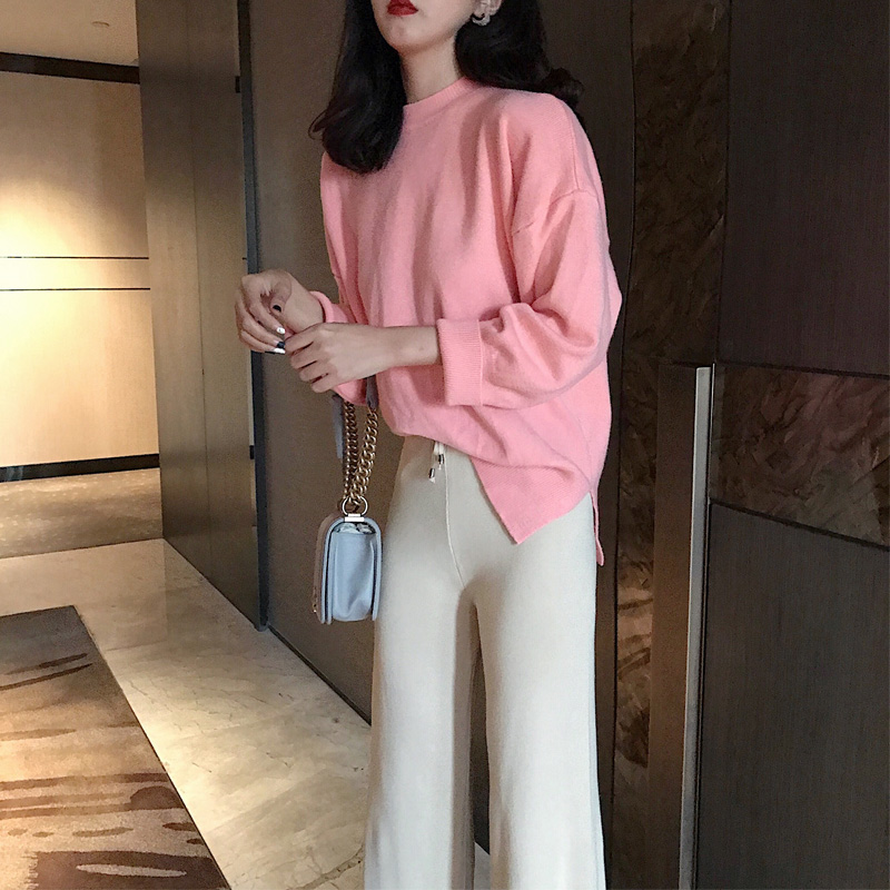 / 港味chic復古寬松圓領套頭慵懶風毛衣女長袖+針織闊腿長褲兩件套