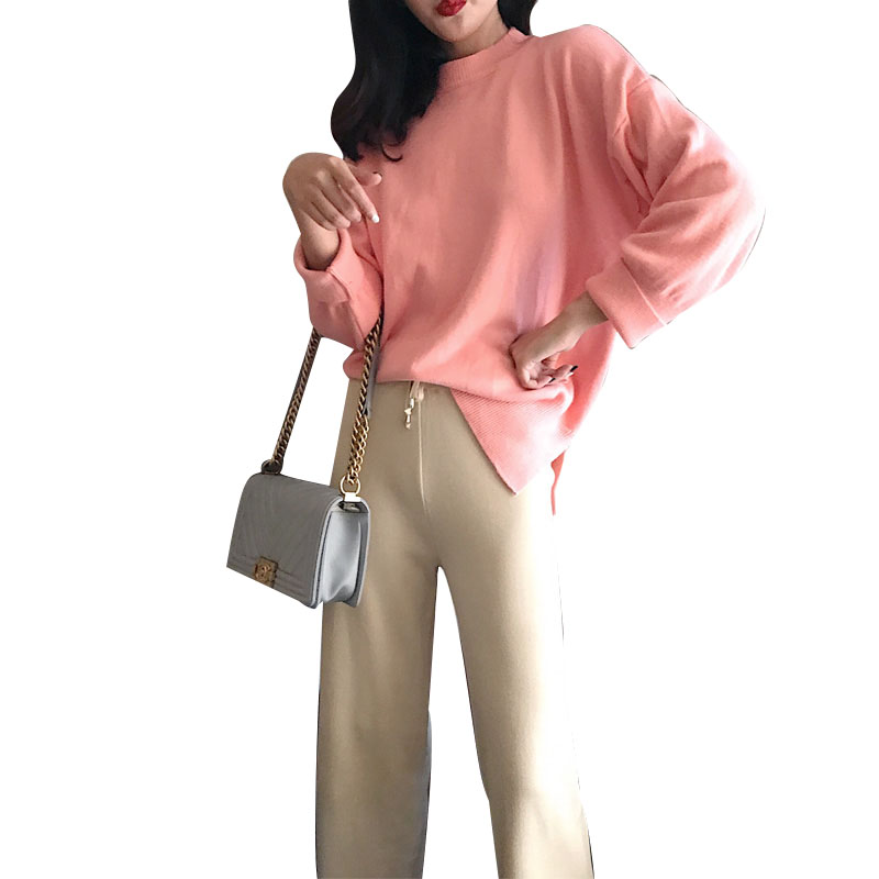 韓版chic甜美風粉色寬松圓領毛衣+顯瘦百搭純色毛呢闊腿褲兩件套