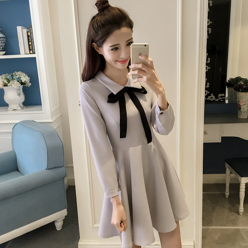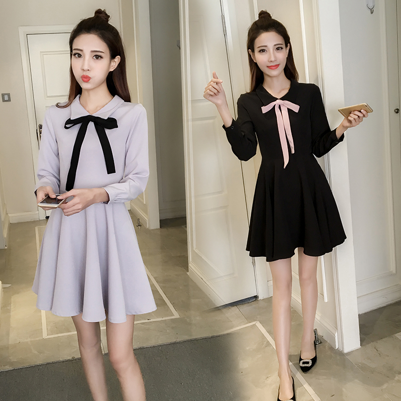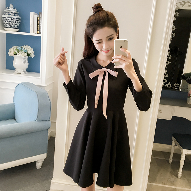 早春新款復古赫本小黑裙顯瘦高腰長袖連衣裙秋冬女蓬蓬打底裙