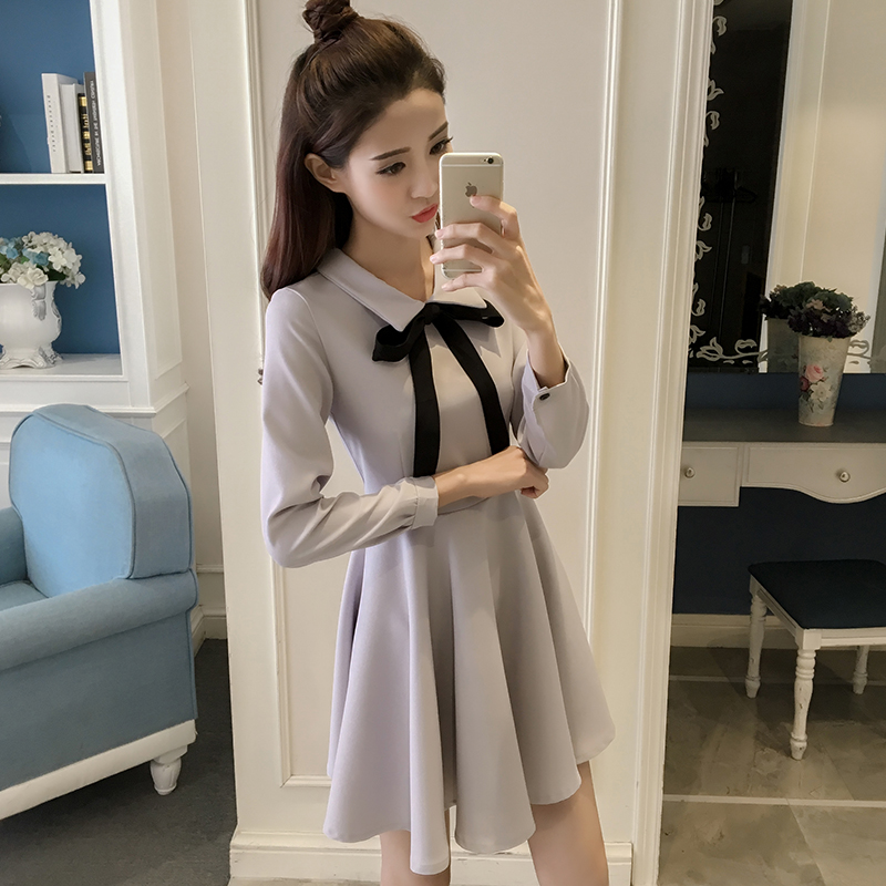 / 早春新款復古赫本小黑裙顯瘦高腰長袖連衣裙秋冬女蓬蓬打底裙