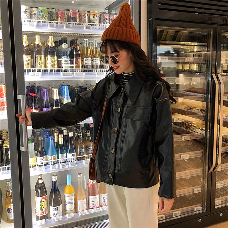 港味chic百搭PU皮夾克女秋裝裝2018新款復古寬松翻領機車服外套潮