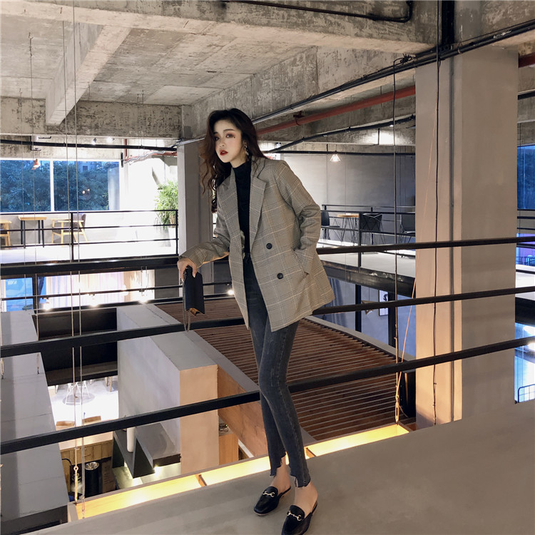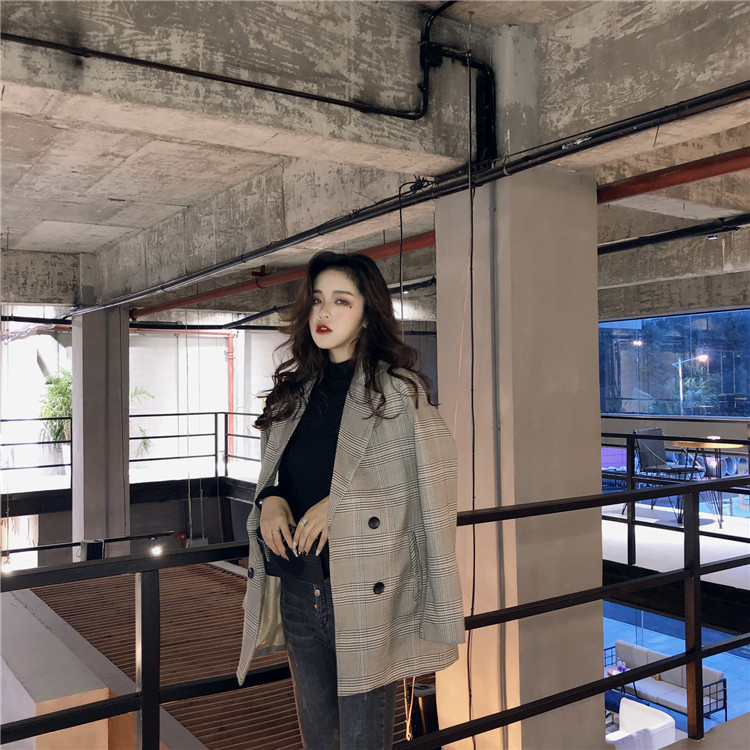 / 港味小香風時尚百搭復古格子西裝女秋裝新款中長款休閑氣質外套潮