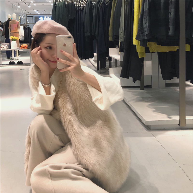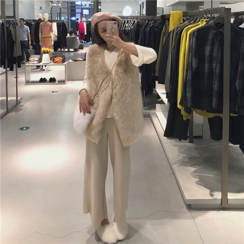 女神套裝秋冬皮草仿水貂絨毛毛馬夾+V領長袖毛衣+寬松毛呢闊腿褲