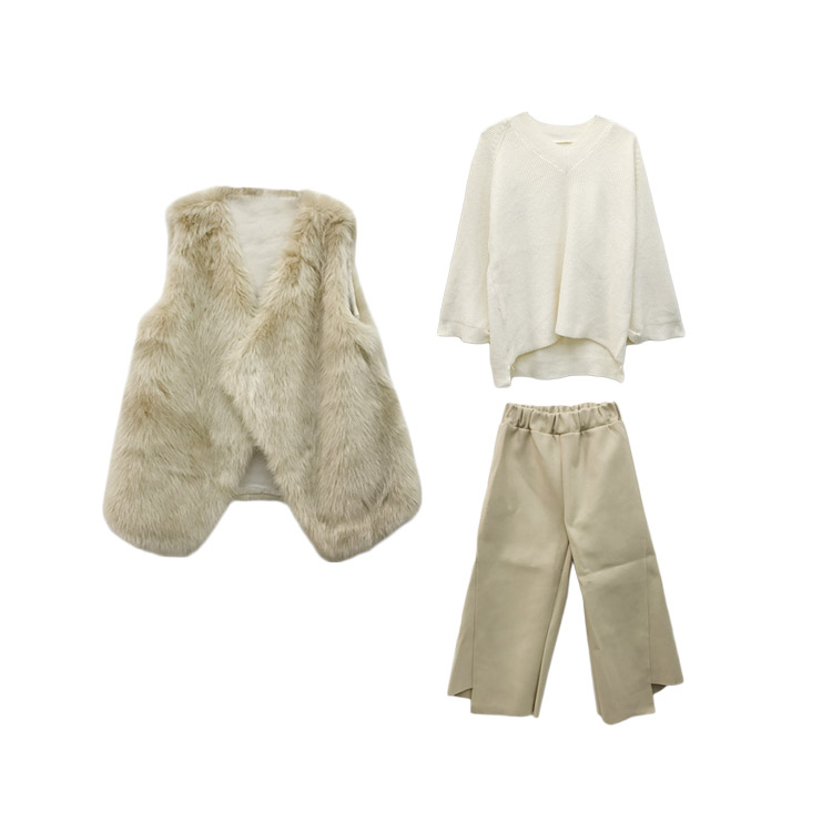 白色毛衣|杏色闊腿褲|杏色毛毛馬甲