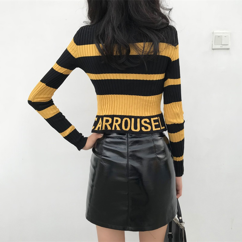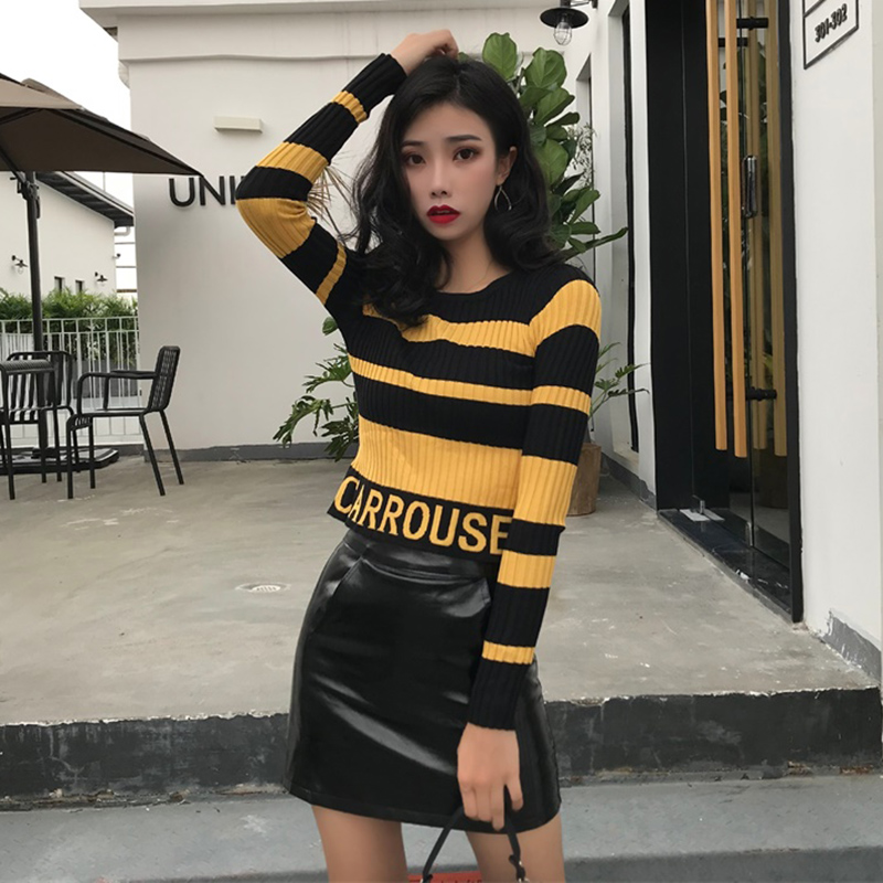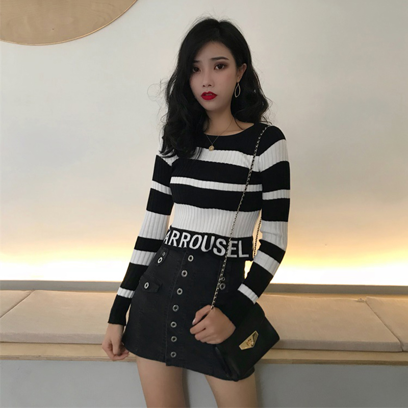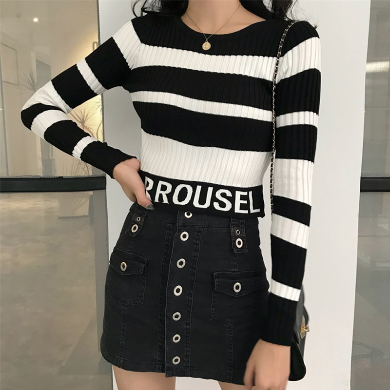 毛針織衫女秋裝2018新款韓版修身顯瘦黑白條紋字母長袖露臍短上衣