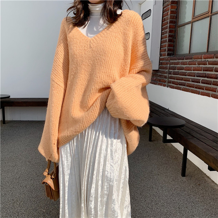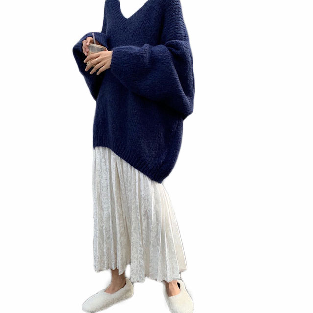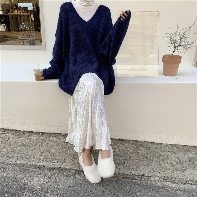 港味寬松顯瘦百搭V領慵懶長袖毛衣女秋冬2018新款+百褶半身裙套裝