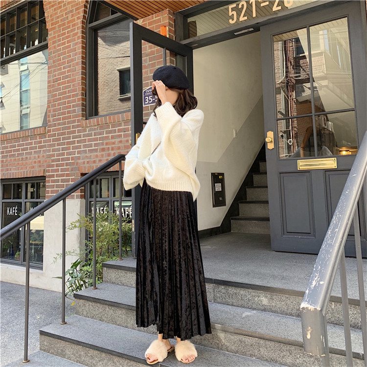 / 港味寬松顯瘦百搭V領慵懶長袖毛衣女秋冬2018新款+百褶半身裙套裝