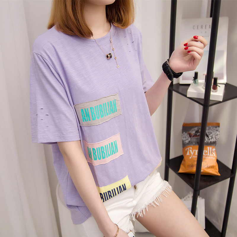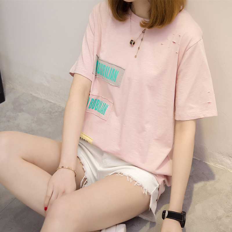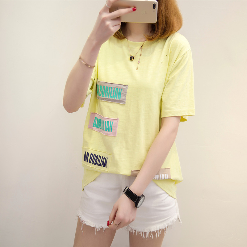 夏裝新款女裝寬松體恤衫打底貼布白色t恤女短袖韓版上衣女夏