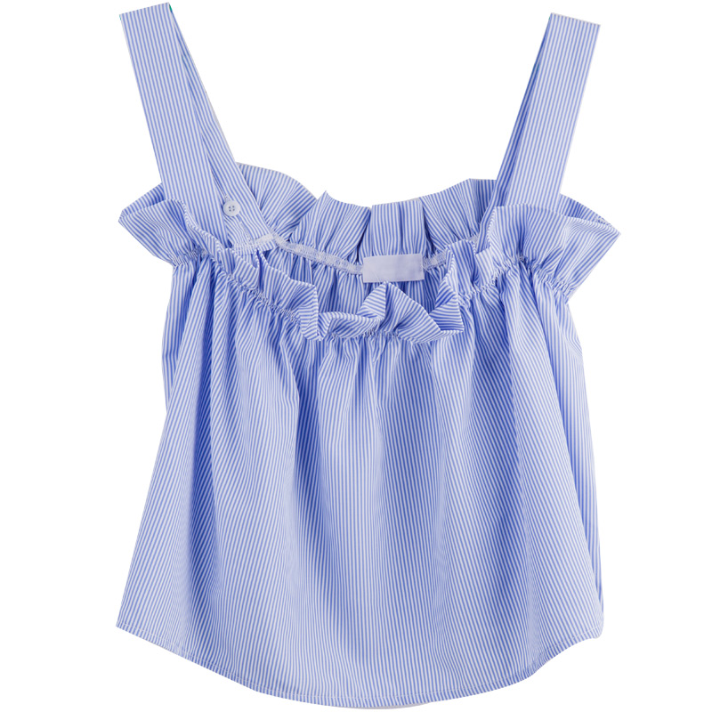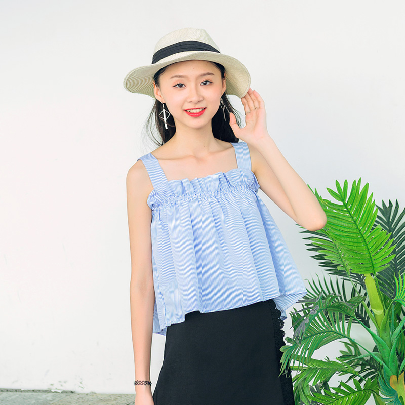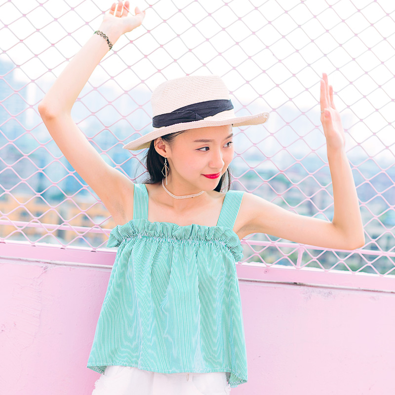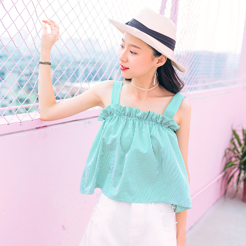 / 條紋木耳邊吊帶背心夏裝新款韓版女裝學生小清新短款百搭上衣