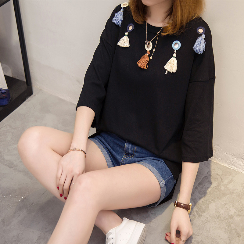 短袖上衣女夏新款寬松t恤女中長袖韓版鏤空流蘇打底體恤百搭