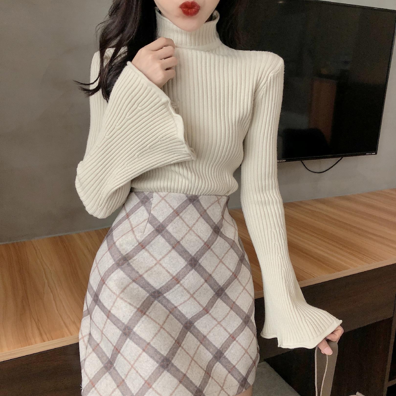 / chic早秋毛衣慵懶風喇叭袖半高領加厚套頭長袖針織衫打底衫毛衣女