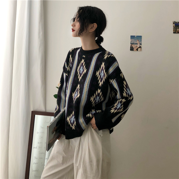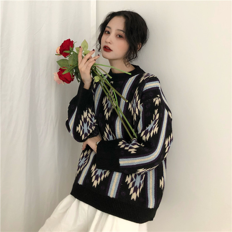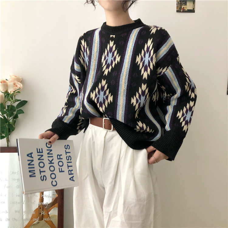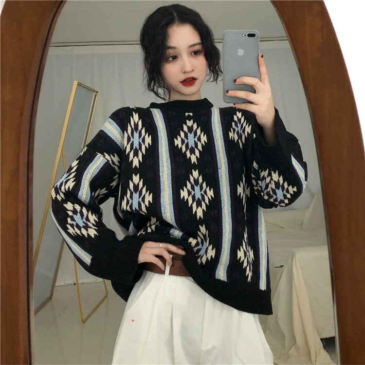 / 秋裝女2018新款港味復古圖案提花毛衣慵懶寬松長袖針織衫打底上衣