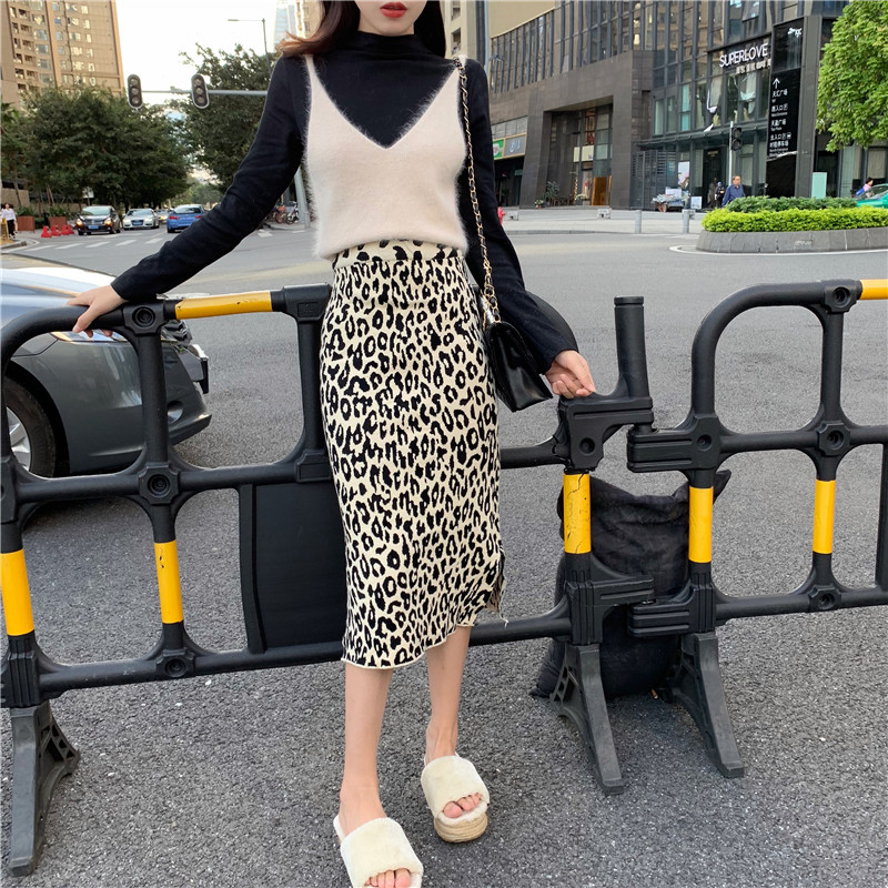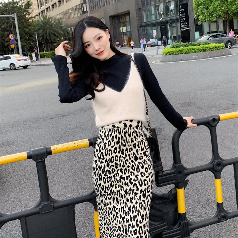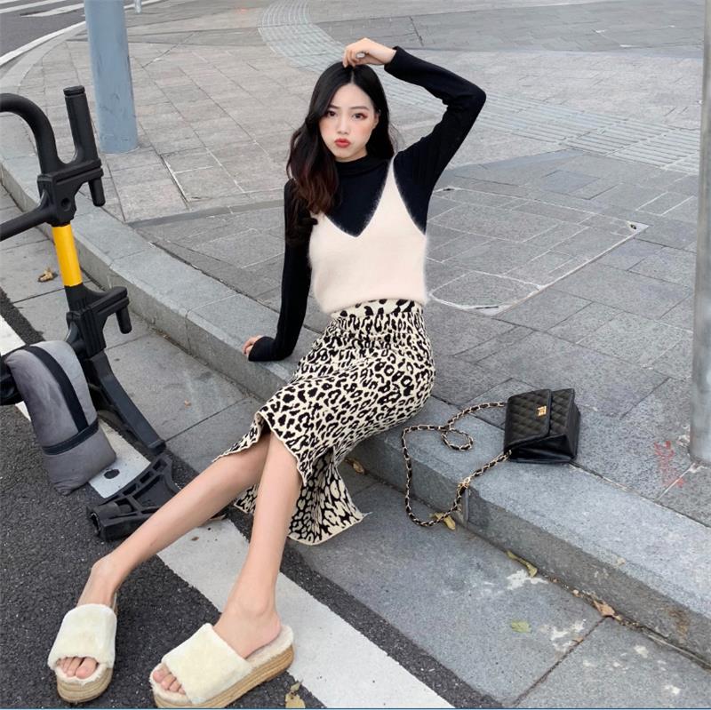 新款秋冬復古慵懶毛毛吊帶針織打底衫高腰針織豹紋半身裙時尚套裝
