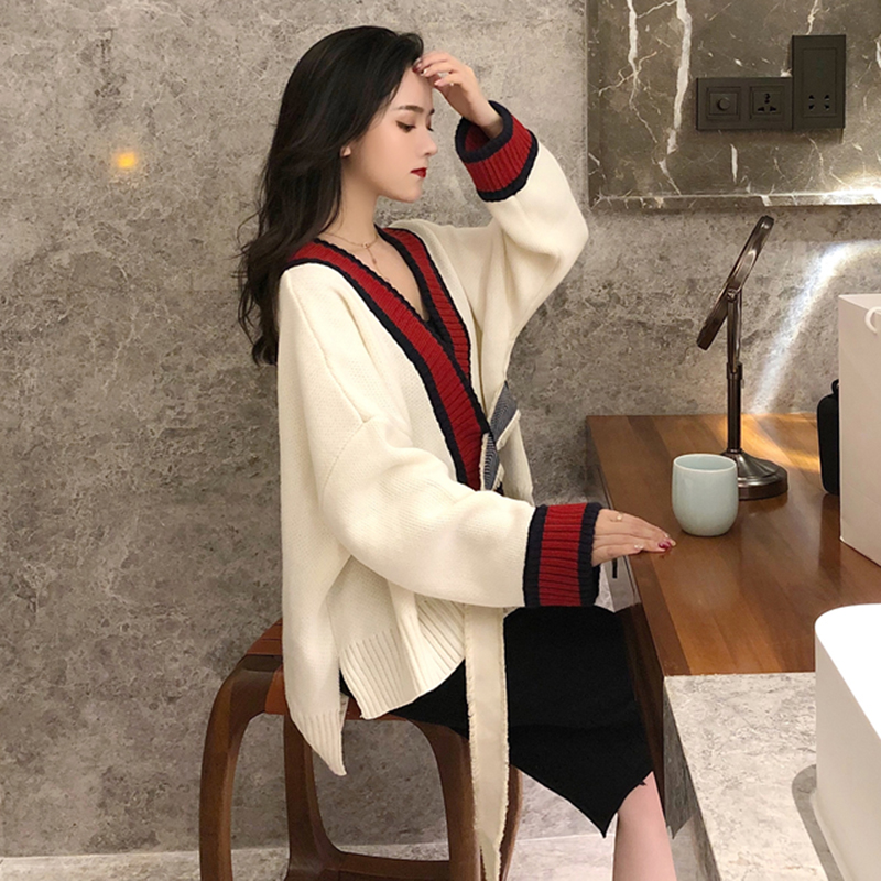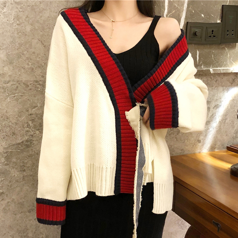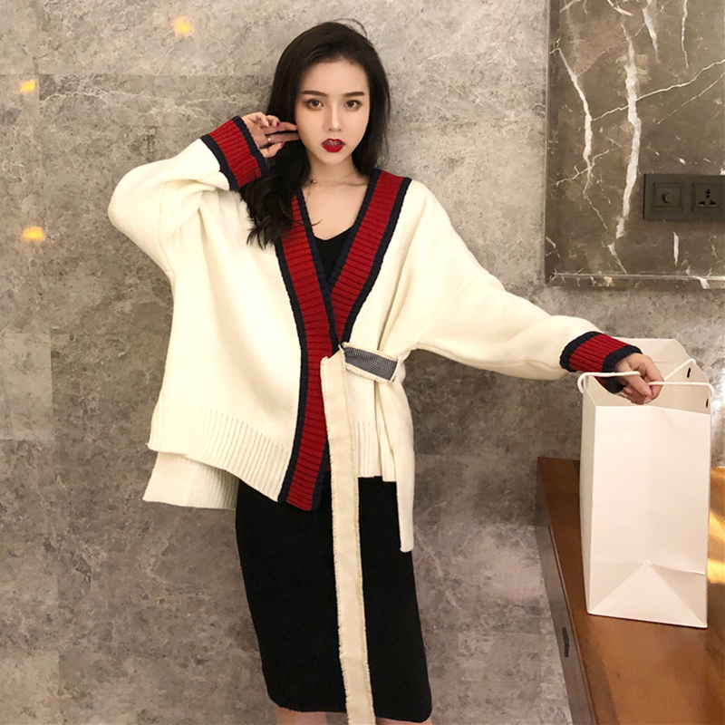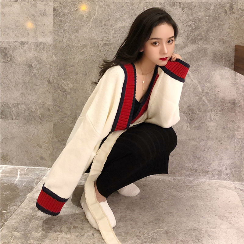 / 韓版時尚套裝女秋新款慵懶風拼色寬松綁帶毛衣開衫打底針織吊帶裙
