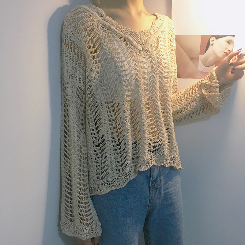 春裝2018新款女裝花邊v領鏤空罩衫復古短款空調衫透視薄針織上衣