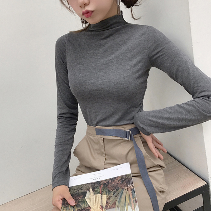 早秋2018新款女裝韓版修身顯瘦半高領長袖白T恤百搭緊身打底上衣