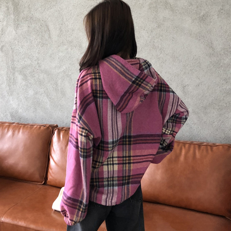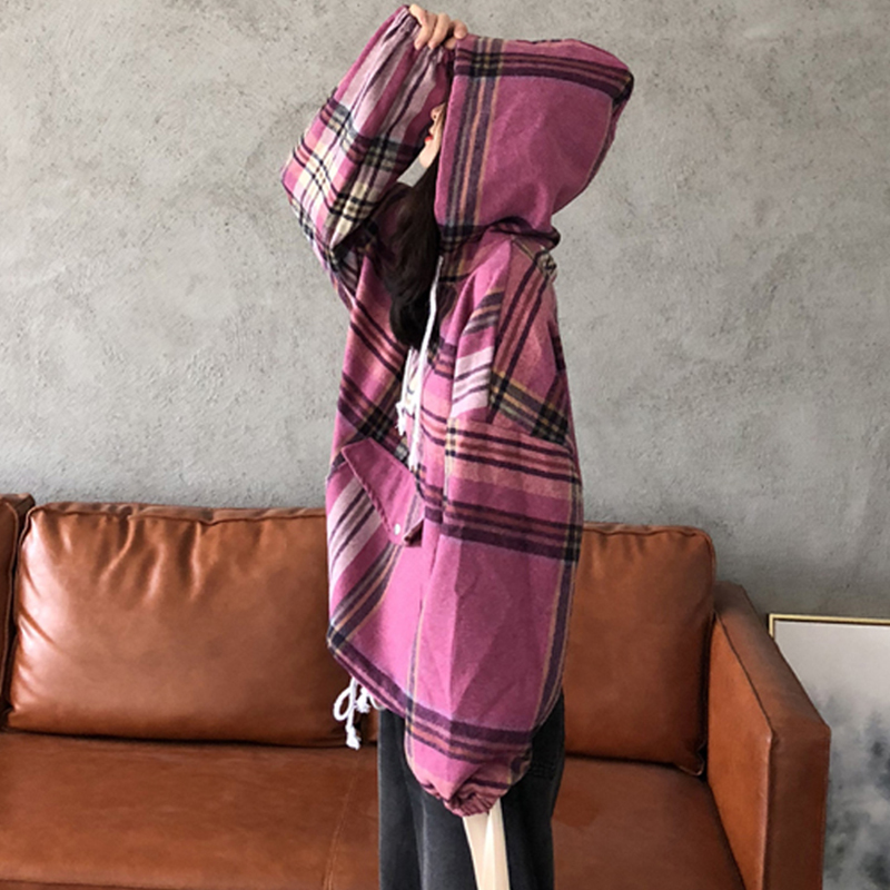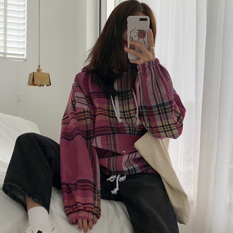 / 毛呢格子連帽衛衣2018新款女秋冬裝港風時尚抽繩慵懶外套休閑上衣
