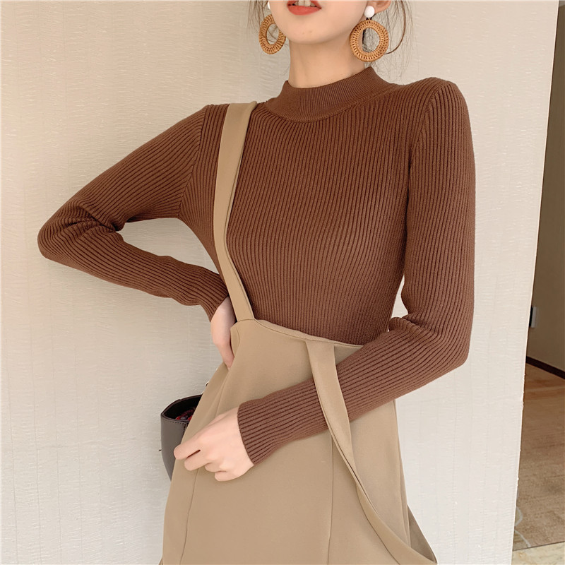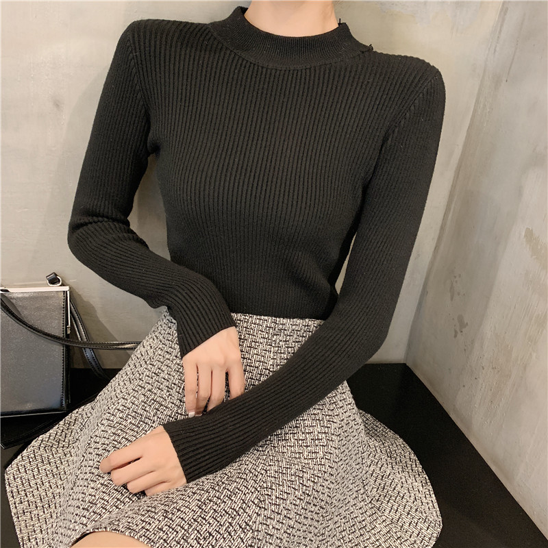 冬季新款韓版chic半高領T恤百搭純色針織衫修身顯瘦長袖打底衫女