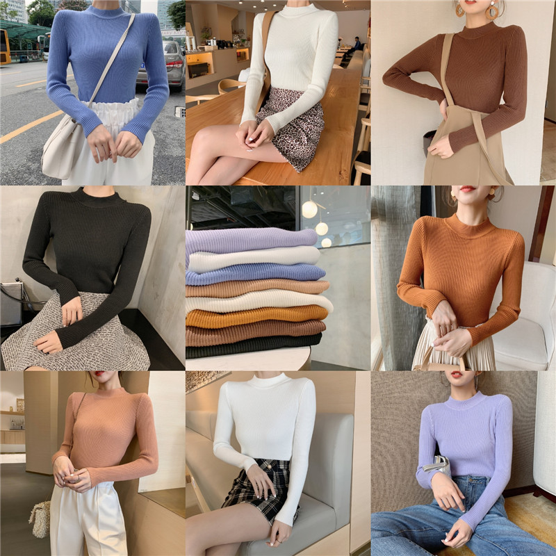 / 冬季新款韓版chic半高領T恤百搭純色針織衫修身顯瘦長袖打底衫女