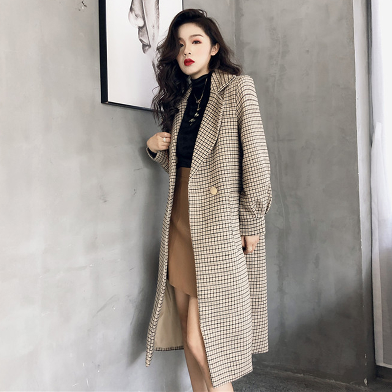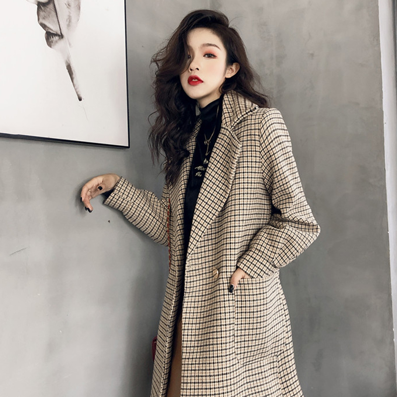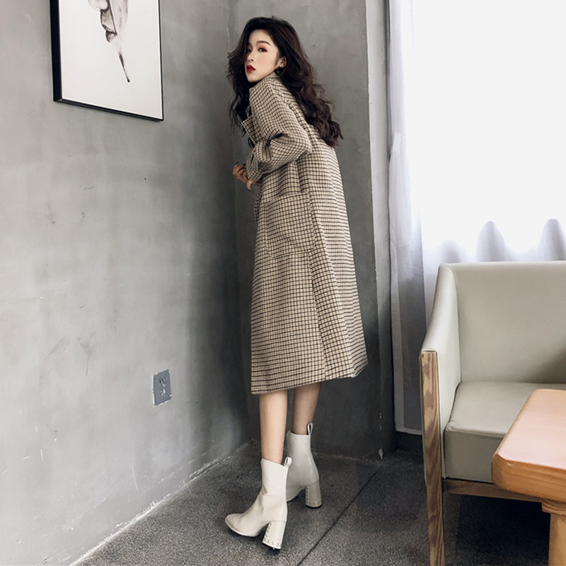 / 復古格子西裝領氣質長款毛呢外套秋冬女裝新款寬松長袖呢子大衣潮