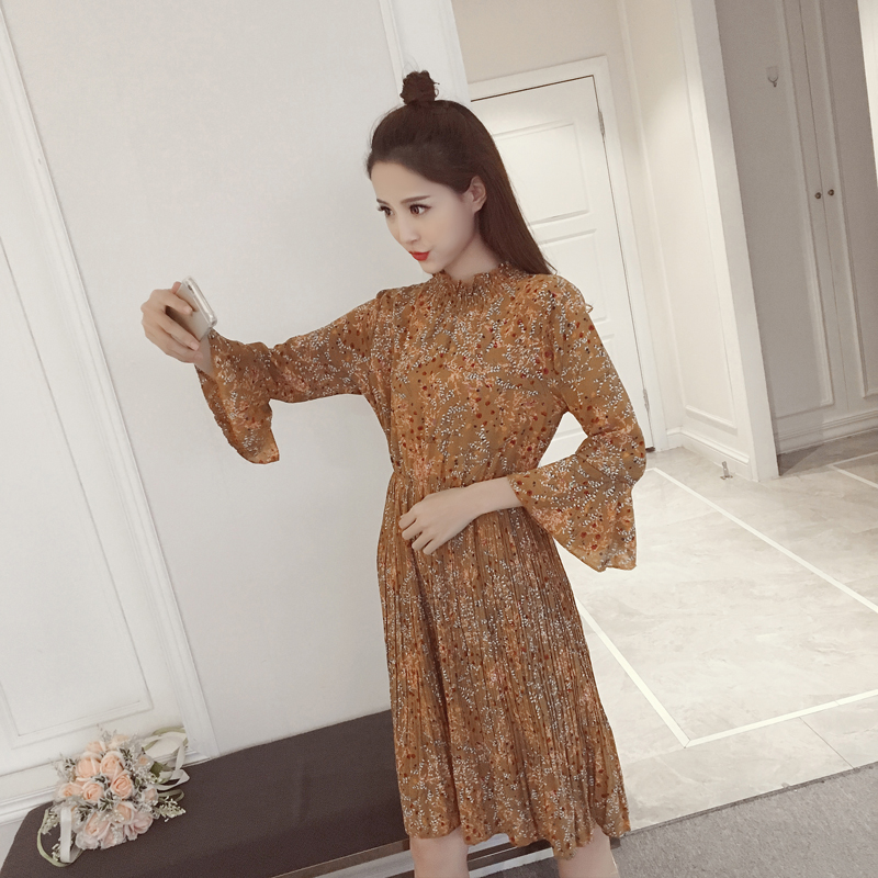 / 新款女裝韓版馬甲兩件套顯瘦中長款復古碎花雪紡長袖連衣裙春